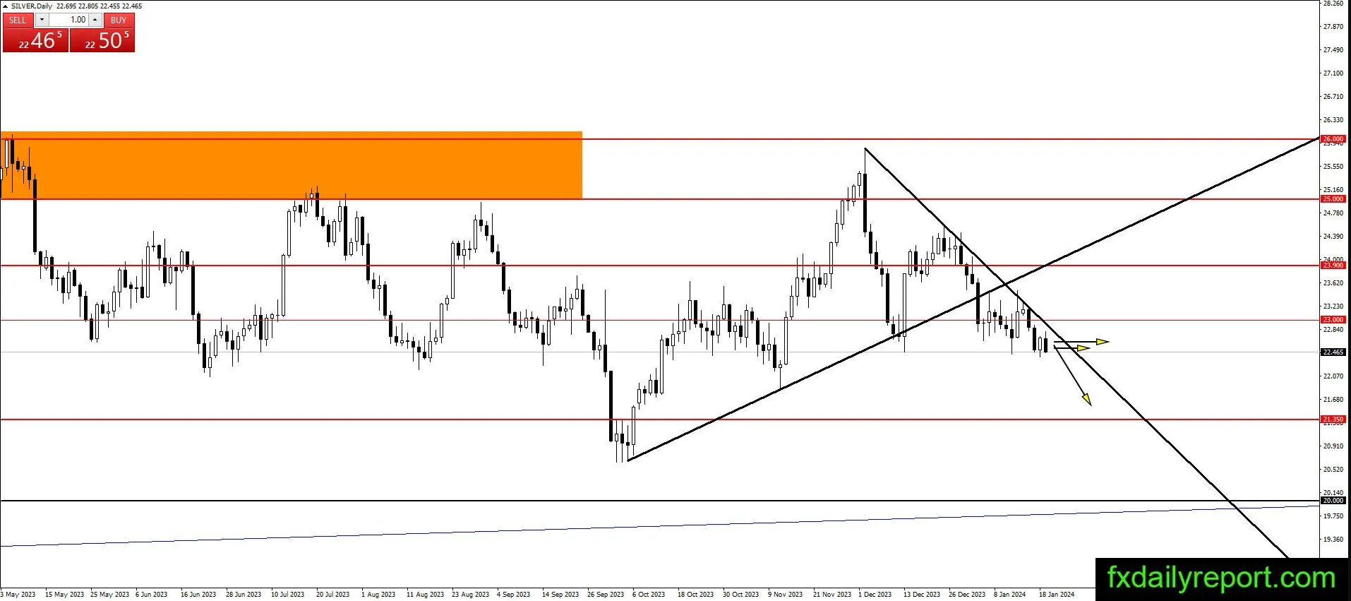 白银价格的看跌压力仍在继续,目前价格正在测试本周形成的低点。如果出现看跌突破并且价格快速下跌,那么21.35美元点将是值得关注的下行目标。为了恢复看涨趋势,白银价格需要收于23.90美元上方。