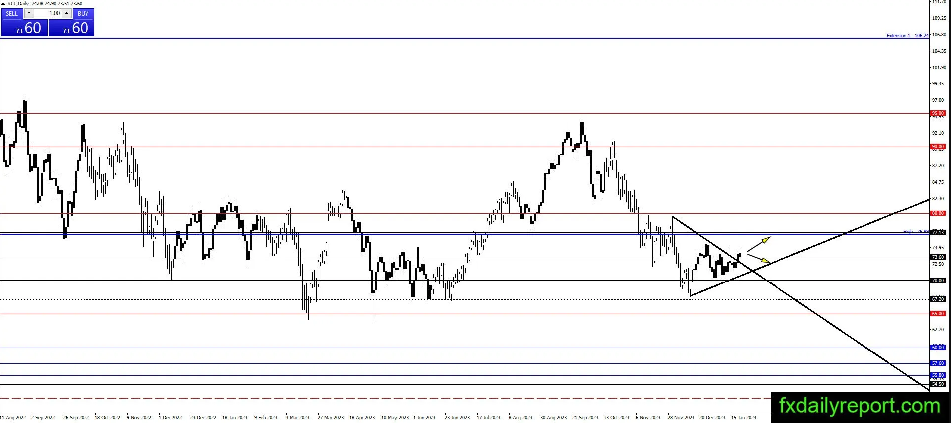 昨天原油价格上涨并收于三角形形态之上。突破该模式确认看涨趋势可以恢复。如果价格上涨,则77.13美元是值得关注的上行目标。另一方面,如果价格从当前价格大幅下跌,则可能会再次测试70.00美元。
