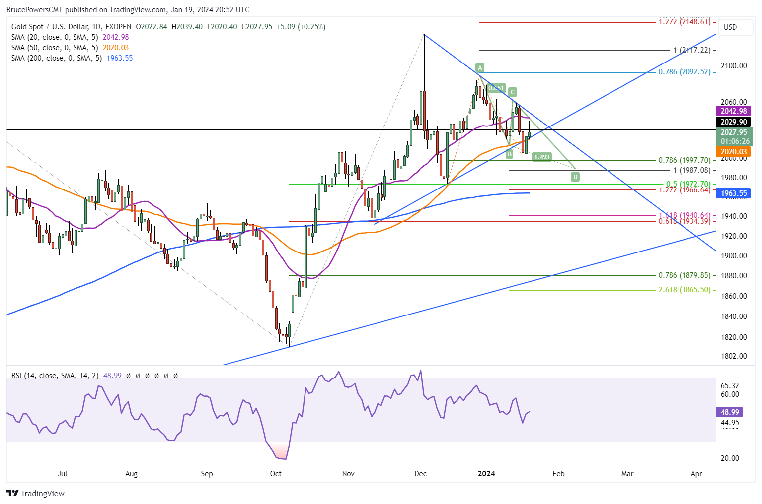 当天的阻力位略低于20日均线2,043 点,使得金价夹在顶部的20日均线和底部的50日均线之间提供支撑。