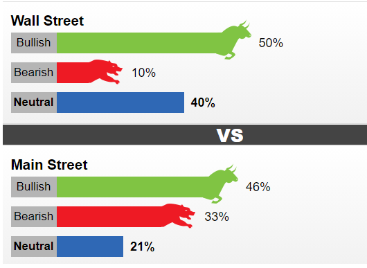 共有20位市场专业人士参加了Kitco News的华尔街调查。其中10位分析师(占50%)看涨金价,2位分析师(10%)看空,8位分析师(40%)持中性看法。