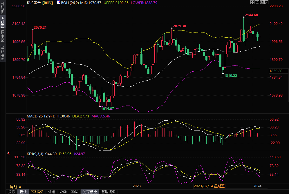 现货黄金上周五收报2029.26美元/盎司,周线下跌0.94%%。