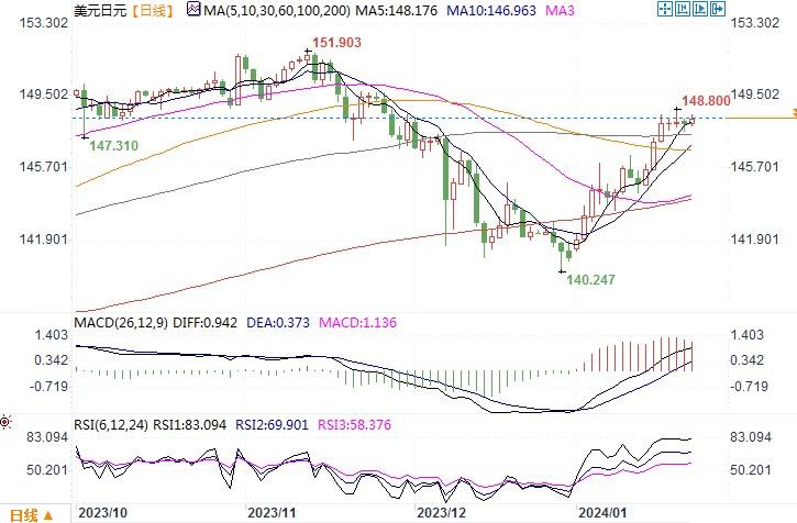 周一(1月22日),美元兑一篮子货币周一几无变化,日元兑美元盘中从上周五触及的一个月低位148.80升至147.61,而纽约盘尾最终下跌0.1%,收盘在148.06。日本央行开始为期两天的政策会议,鉴于此前日本央行官员的鸽派发言,市场对日本央行在此次会议上退出负利率的押注已减少。市场猜测日本央行总裁植田和男可能会在公布决策后的新闻发布会上倾向反对4月退出负利率,并且央行可能会降低全年通胀预测,这将可能推动日元兑美元进一步回软。日线图上,美元/日元上周成功收盘并企稳在147.47技术位上方,147.47是(11-12月)151.92-140.27跌势的61.8%回撤位。图形上该货币对似乎进入上升旗形整理状态之中,进一步上行,重新测试149.17费波纳奇水平的可能性变大,149.17是151.92-140.27跌幅的76.4%回撤位,更进一步的目标则是150.00整数心里关口。日内还须留意日本央行利率会议结果,谨慎防范日本央行意外放鹰的风险。