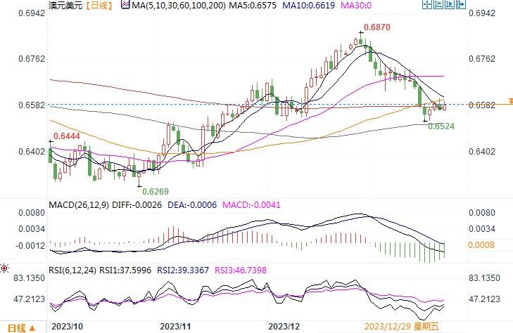 澳元兑美元纽约尾盘下跌0.4%,收盘在0.6570。美国3月降息的希望消退,持续给到澳元压力。澳元当前仍然受到全球利率前景变化的影响,本周的事件可能进一步明确全球降息的时机,这些事件包括日本央行和欧洲央行的政策会议以及美国个人消费支出(PCE)物价指数。尤其是来自美国的数据,若继续呈现一幅增长强劲的图案,美元降息预期概率将进一步减弱,澳元也会因此而继续承压。从技术图形来看,无论日线、周线还是月线级别图上,澳元/美元均显疲态,上年12月份的高点0.6871构成了顶部,技术指标明显下摆之中,显示澳元空头势能强。在日线图上有形成头肩顶形态之嫌。下方若跌穿0.65水平,澳元下行幅度将会进一步延展。上方唯有回升至0.6720之上,才能扭转颓势。