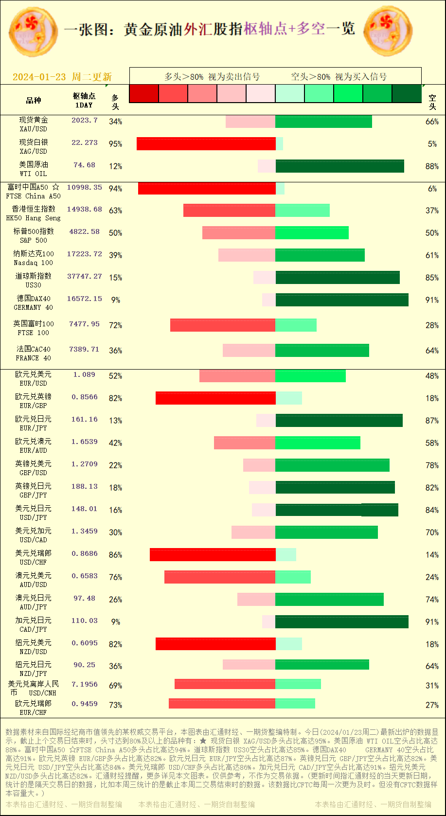 标题:一张图:2024/01/23黄金原油外汇股指"枢纽点+多空占比"一览