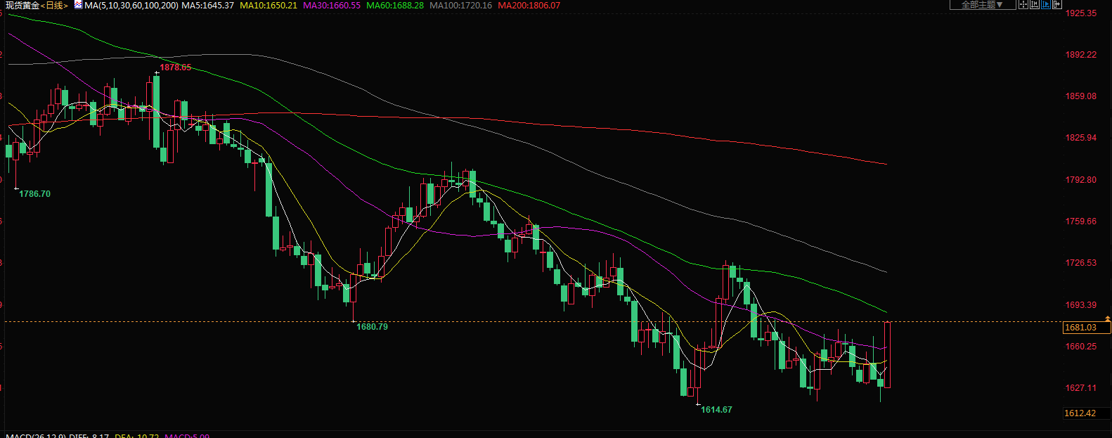 白银急升6.9%,至每盎司20.80美元,铂金上涨4.3%,至每盎司957.97美元,钯金上涨3.8%,至每盎司1869.62美元。