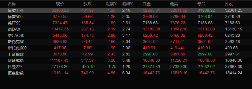 标普500指数上涨1.36%,至3770.55点;纳斯达克指数上涨1.28%,至10475.25点。