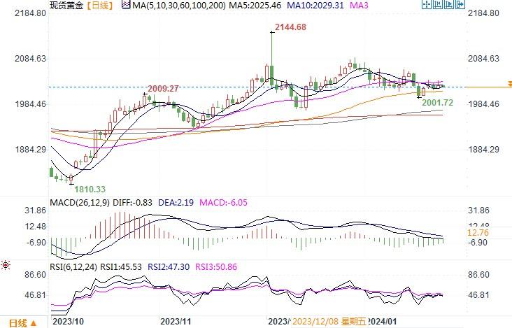汇通财经APP讯——周二(1月23日),金价小幅上涨,0.2%,报每盎司2,025.09美元,黄金整体上仍维持着窄幅震荡的走势。投资者正紧张等待本周一系列美国经济数据公布,以获取有关美联储降息时间表的更多线索。