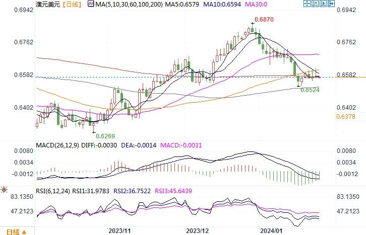 澳元兑美元在0.6575附近徘徊。进入新的一年后,由于交易商推迟了对美联储首次降息的预期时间,美元一直表现坚挺,澳元则受压一路下行,目前勉强守护在0.65水平之上。周三日内,尽管中国宣布降准的刺激经济发展的利好消息,且铁矿石价格上涨,但对澳元的刺激影响不大。当前市场关注的焦点还是放在美国周四、五的放映经济发展和通胀数据上。在左右澳元的走势中,美元的走势仍占主导影响。日线图上,澳元/美元仍处于布林带通道中轨线下方,汇价继续处于窄幅整理之中,技术指标下摆还在延续中,显示澳元的弱势格局未有改变。预料美国周四和周五所公布得GDP和核心个人消费支出(PCE)公布后,澳元/美元或有望走出窄幅整理走势的局面。