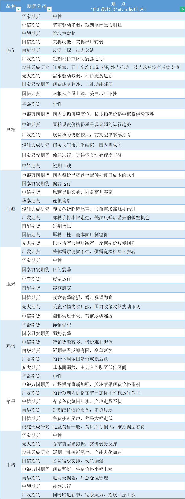 标题:期货公司观点汇总一张图:1月29日农产品(棉花、豆粕、白糖、玉米、鸡蛋、生猪等)