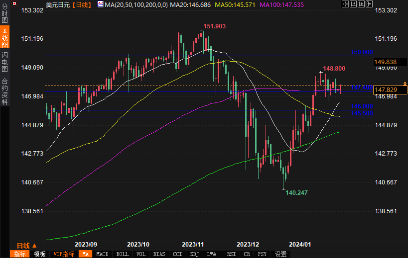 美元兑日元周一大幅下跌,但周二勉强企稳,从100日移动均线147.40附近反弹。如果反弹势头增强,趋势线阻力位将出现在148.20和149.00。在此之上,150.00心理关口是下一重要阻力。