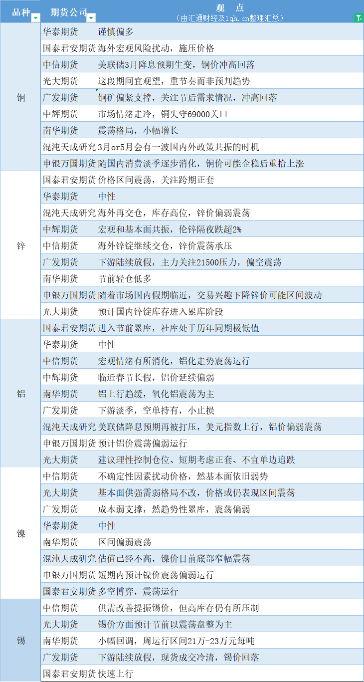 期货公司观点汇总一张图:2月2日有色系(铜、锌、铝、镍、锡等)