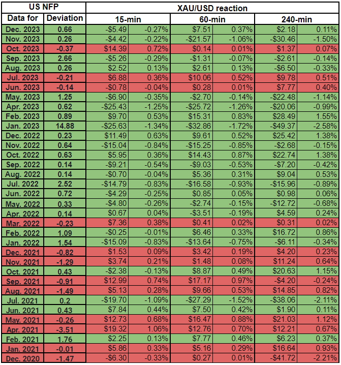 我们绘制了非农数据发布后的15分钟、1小时和4小时内的黄金价格反应。然后,我们将黄金价格的反应与实际非农结果与预期结果之间的偏差进行比较。