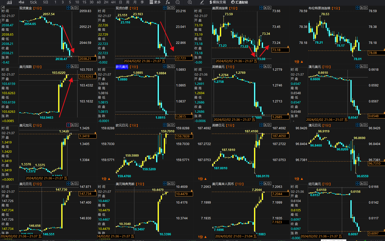 短线市场反应强烈,1分钟内,黄金及非美货币全线大跌,美国1月非农意外大增35.3万,