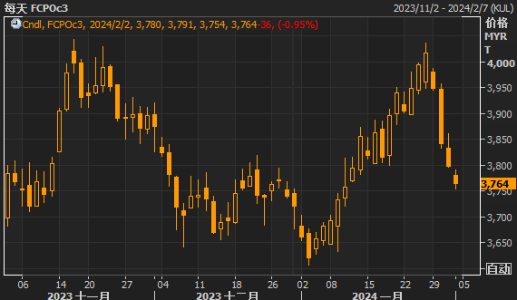 马来西亚衍生品交易所4月交割的基准棕榈油合约FCPOc3下跌36林吉特,或0.95%,收于每吨3762林吉特(797.88美元),为1月11日以来的最低收盘价。