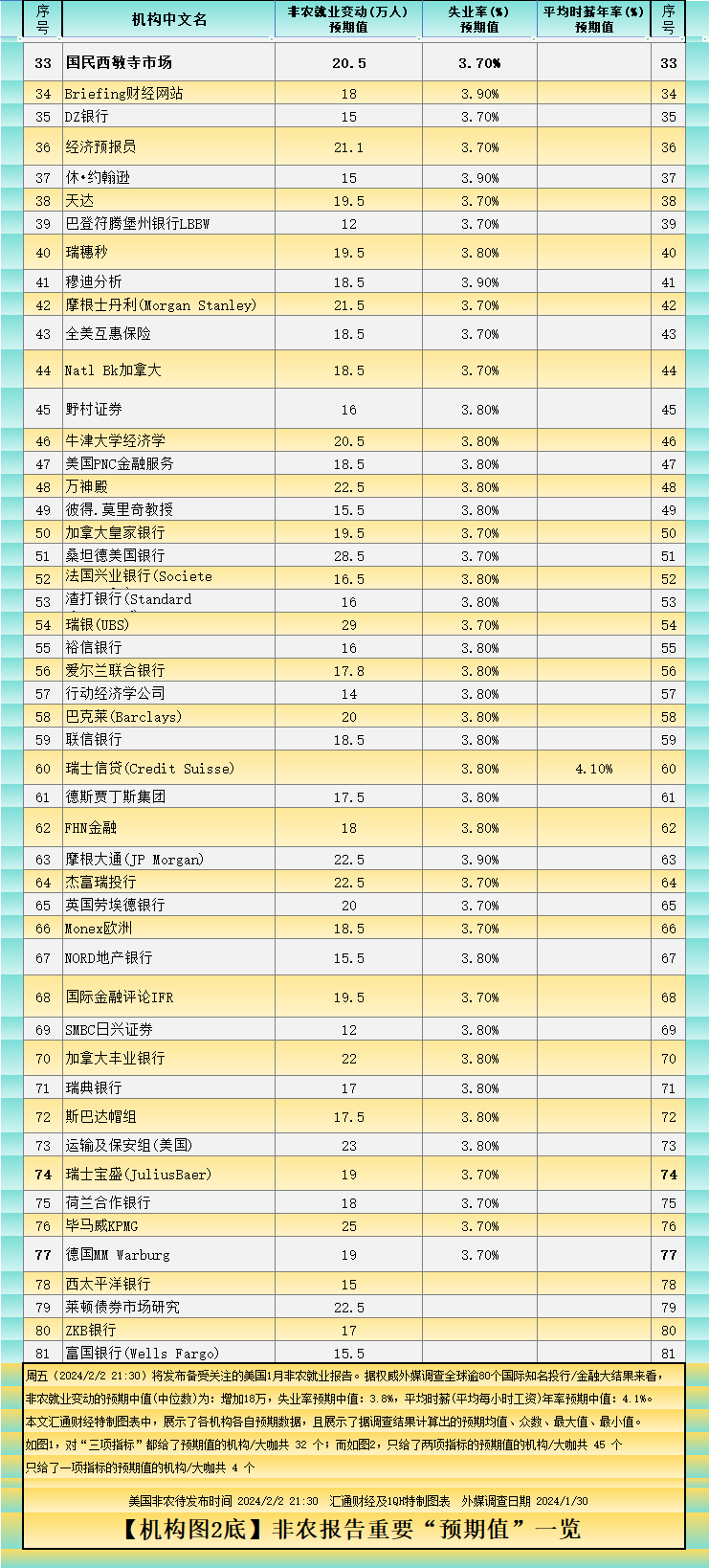 汇通财经APP讯——周五(2024/2/2 21:30)将发布备受关注的美国1月非农就业报告。今晚的非农,虽刚刚经历过美联储决议,但依然可能引发快速波动的大行情(详见本文底下分析)。先来看看“最全”非农预测:逾80家机构对非农三大指标的详细预期值。