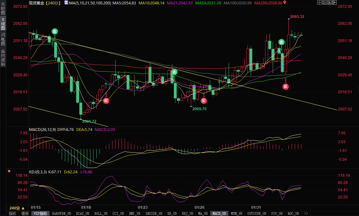 在美国劳工部数据显示上周初请失业金人数增幅超过预期后,现货黄金周四上涨近1%,最高触及2065.32美元/盎司,为1月2日以来新高,收报2054.881美元/盎司,站在了所有均线上方,这是一个非常强烈的看涨信号。技术分析师指出,金价昨日接近首个看涨目标2065.70美元/盎司,假如突破这一水平,这将为金价进一步大涨铺平道路。