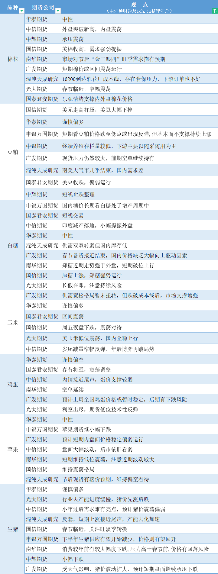 标题:期货公司观点汇总一张图:2月5日农产品(棉花、豆粕、白糖、玉米、鸡蛋、生猪等)