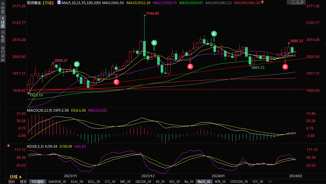 现货黄金一度大幅跳水近30美元,跌至2027.78美元低点,尾盘收报2039.55美元/盎司。周一(2月5日)亚市早盘,