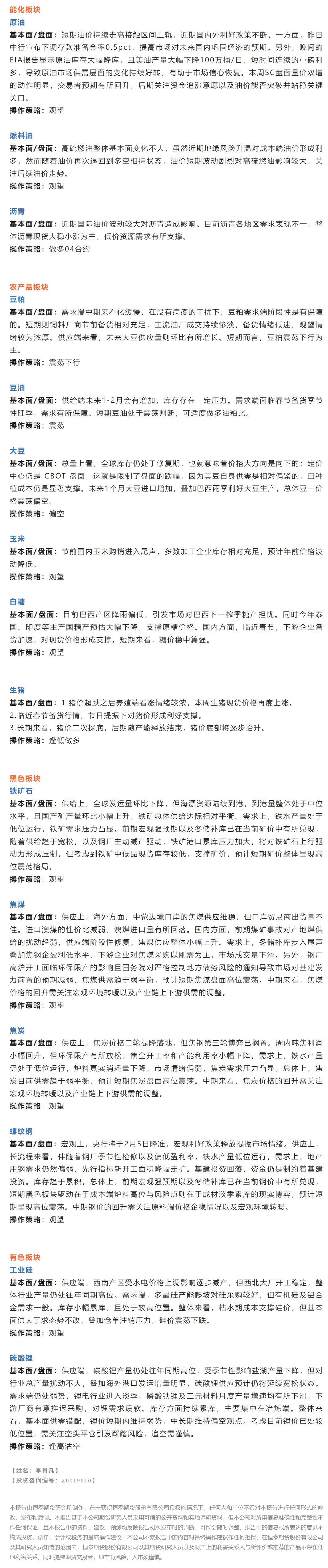 以下是恒泰期货今日早间交易策略,覆盖品种有:宏观分析、原油燃料油等能源化工、豆粕豆油大豆玉米白糖生猪等农产品、黑色系如铁矿石焦煤焦炭螺纹钢、有色系如工业硅碳酸锂等。