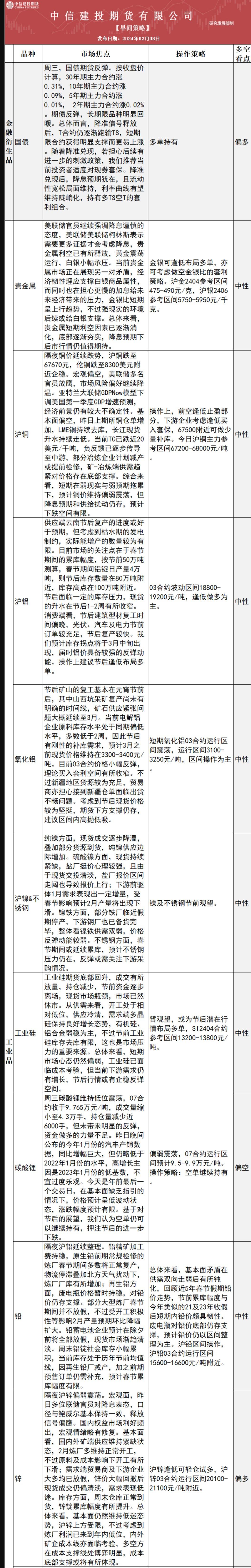 以下为中信建投期货对股指、国债、贵金属、能源化工、有色金属、黑色建材、农产品等期货的操作建议和提醒。