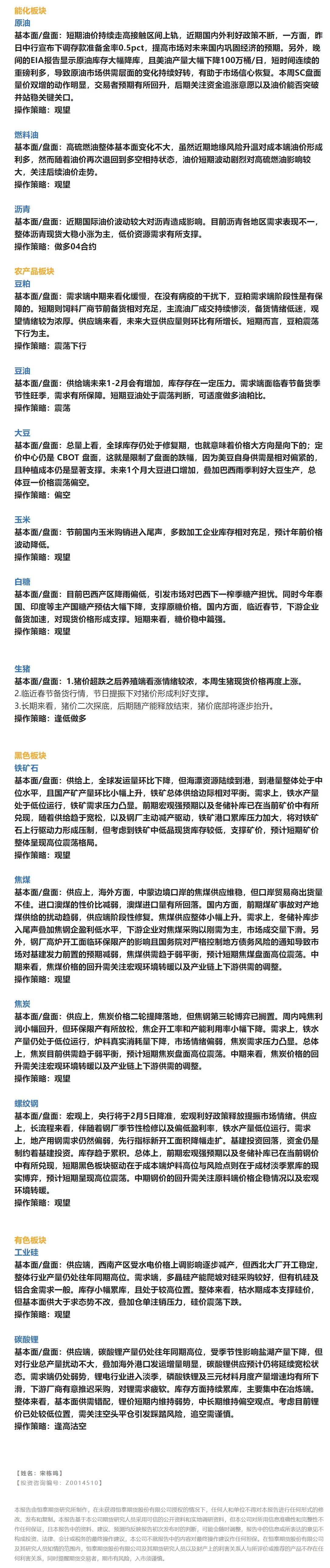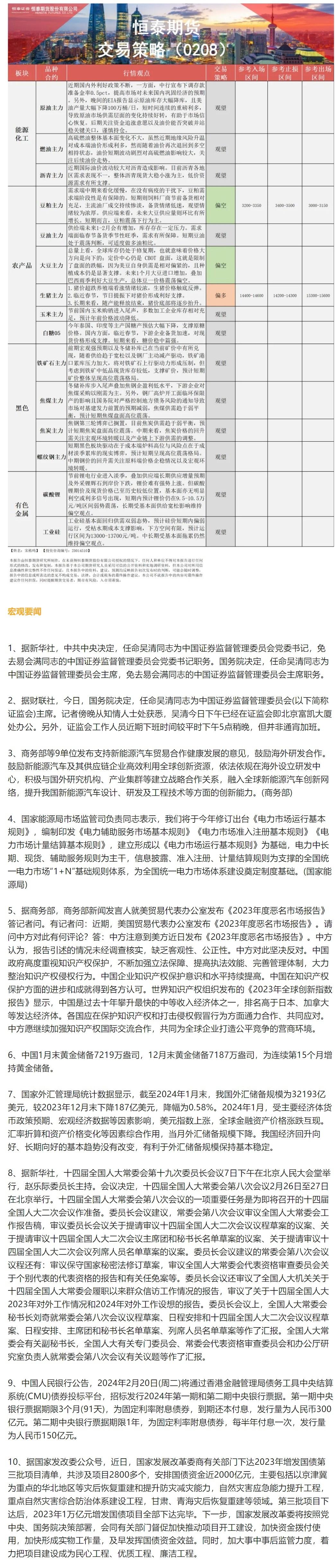 以下是恒泰期货今日早间交易策略,覆盖品种有:宏观分析、原油燃料油等能源化工、豆粕豆油大豆玉米白糖生猪等农产品、黑色系如铁矿石焦煤焦炭螺纹钢、有色系如工业硅碳酸锂等。