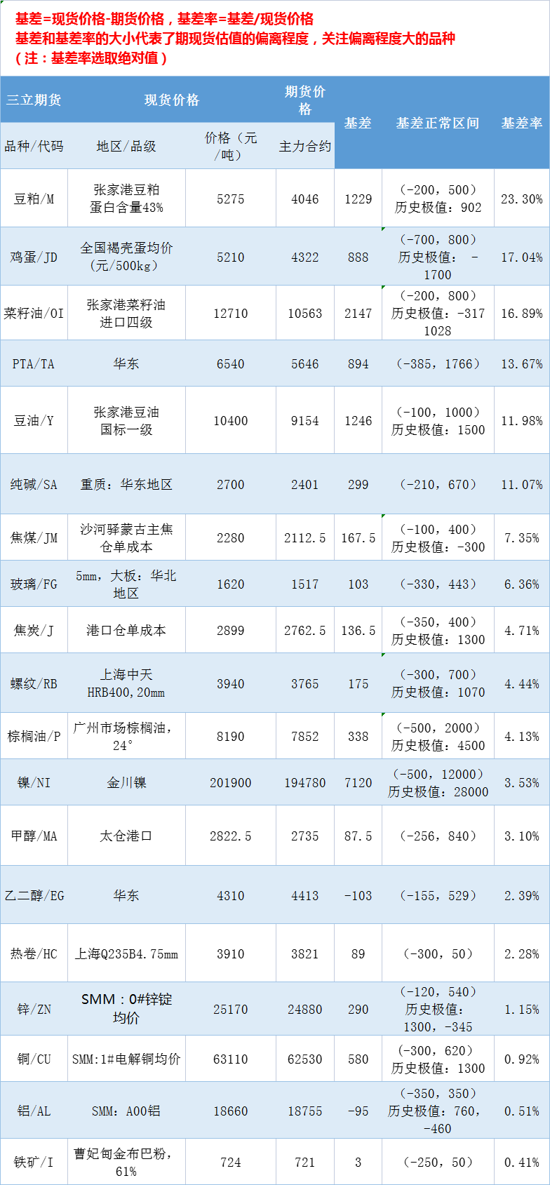 标题:三立期货9月23日基差:一张图尽览有色金属、黑色系、能源化工和农产品基差(按基差率从大到小排序)
