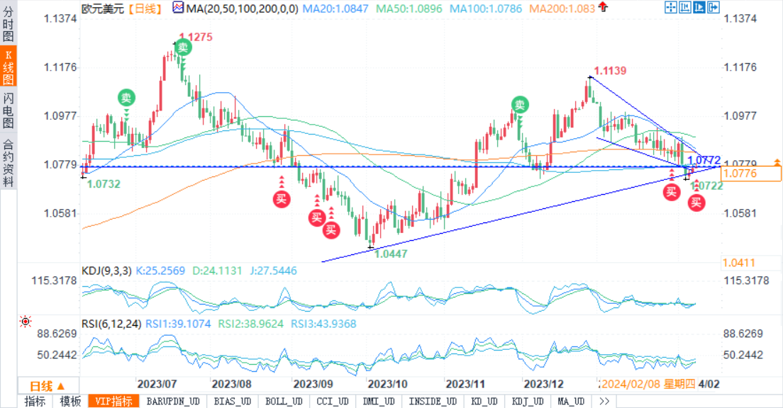 欧元兑美元周三小幅走高,接近密集阻力带1.0780附近。如果多头在未来几天上破这一阻力位,价格可能会反弹至200日简单移动均线和1.0840附近的趋势线阻力位。
