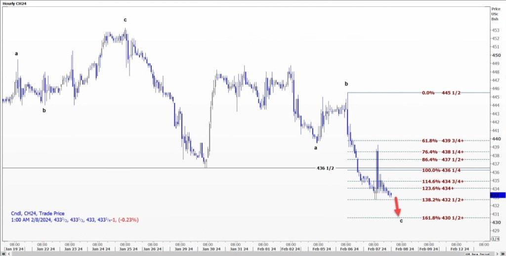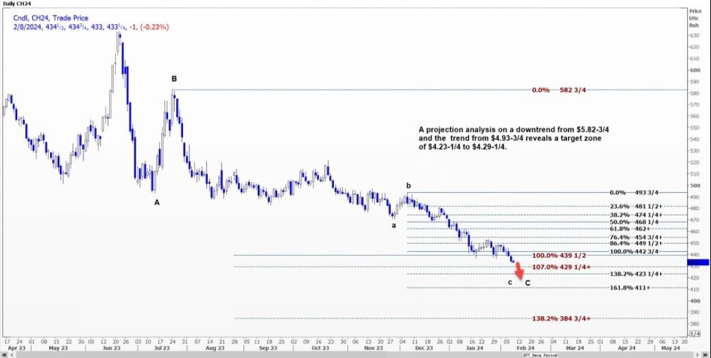 CBOT玉米可能将损失扩大至4.30-50美元CBOT 3月玉米CH24可能将跌幅扩大至每蒲式耳4.30-50美元,完成从4.45-50美元的c波。