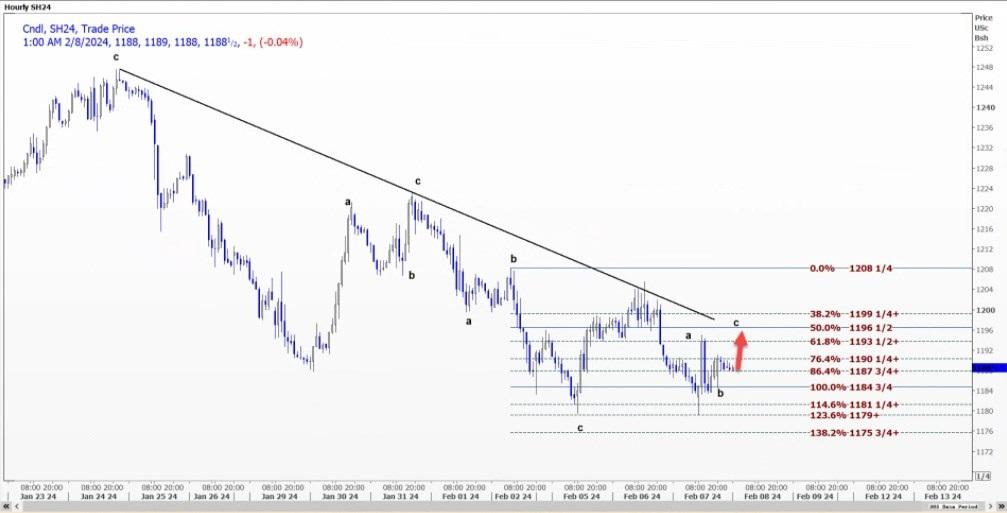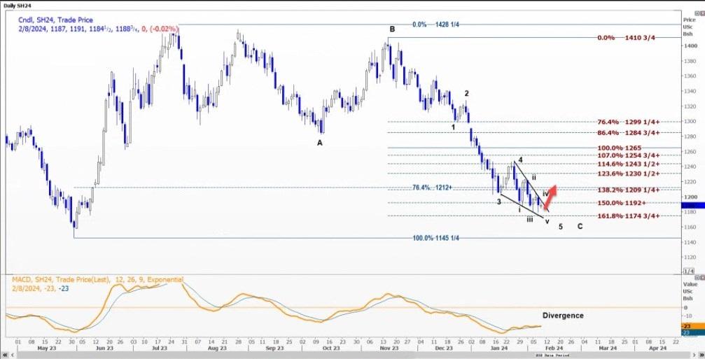 CBOT大豆可能重新测试阻力位11.93-50美元CBOT大豆3月合约SH24可能会重新测试每蒲式耳11.93-50美元的阻力位,正如其波浪形态所示。