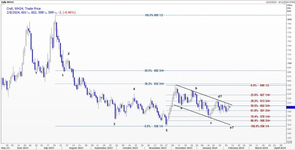 CBOT小麦预计跌至5.9125美元至5.95美元区间CBOT 3月小麦WH24未能突破6.06-50美元的阻力位,预计将跌至每蒲式耳5.9125美元至5.95美元的区间。