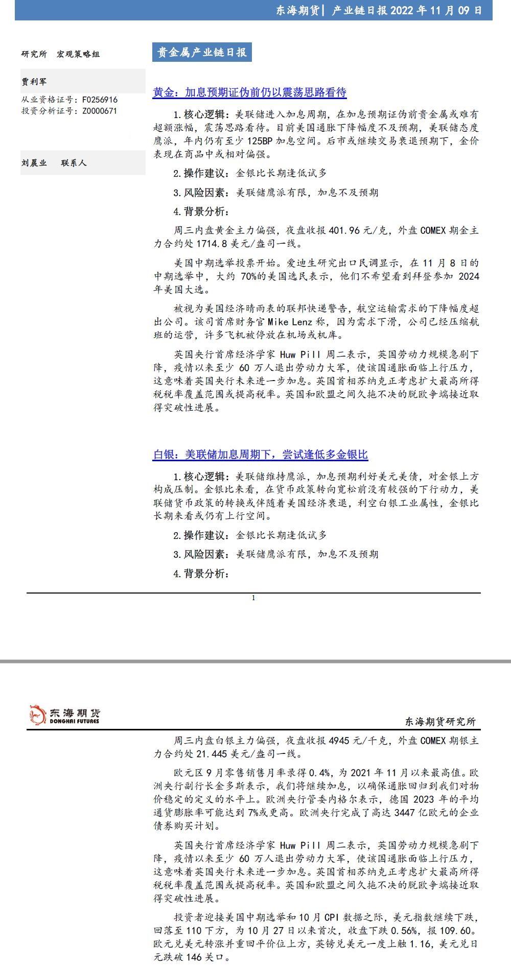 标题:【东海期货11月9日产业链日报】贵金属篇:美元指数下跌,金银偏强