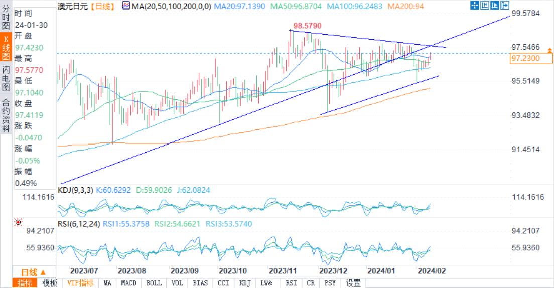 汇通财经APP讯——周五(2月9日),澳元兑日元一路攀升,现报97.2340,涨幅0.36%。
