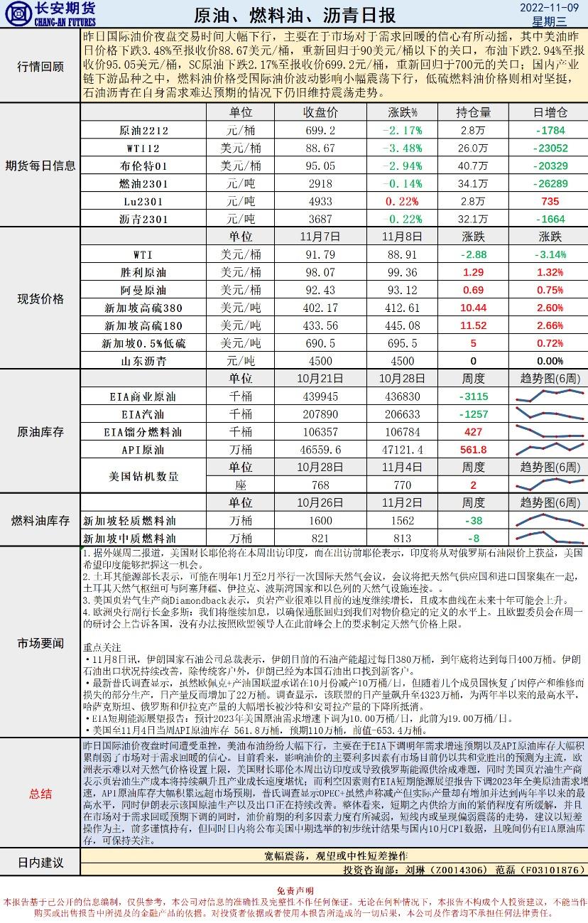 11月9日,长安期货发布原油早评,认为原油将宽幅震荡,建议观望或中性短差操作。