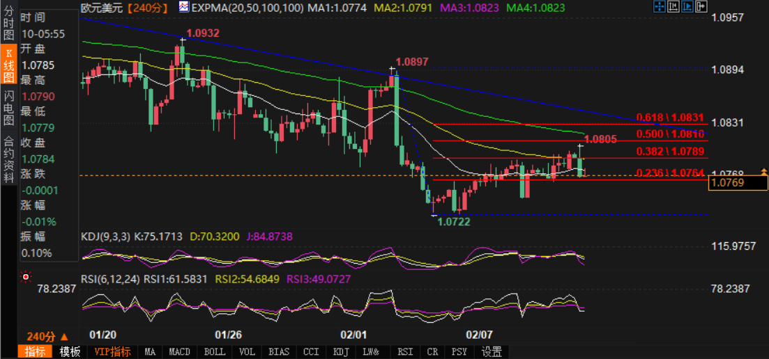 欧元兑美元在四小时内迅速下跌,由最高1.0805跌至1.0770,截至北京时间19:26,跌幅0.13%。欧元主力报1.0784,跌幅0.12%。
