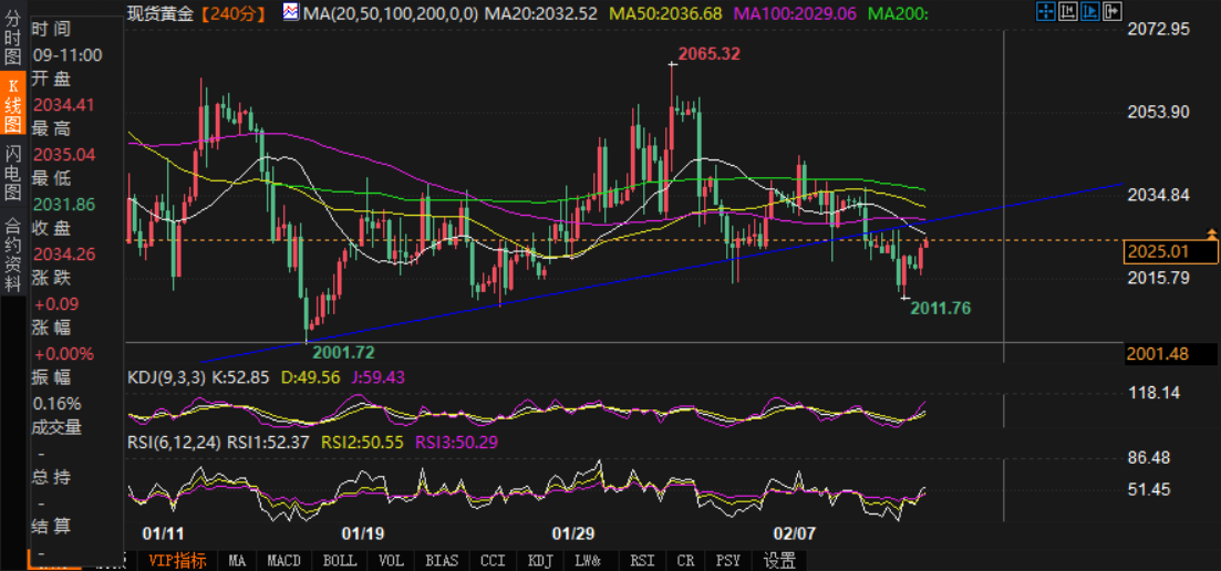 现货黄金价格在2020美元附近徘徊,缺乏明确的方向性。在4小时内从底部回升,盘中报2025.17美元,涨幅0.27%。