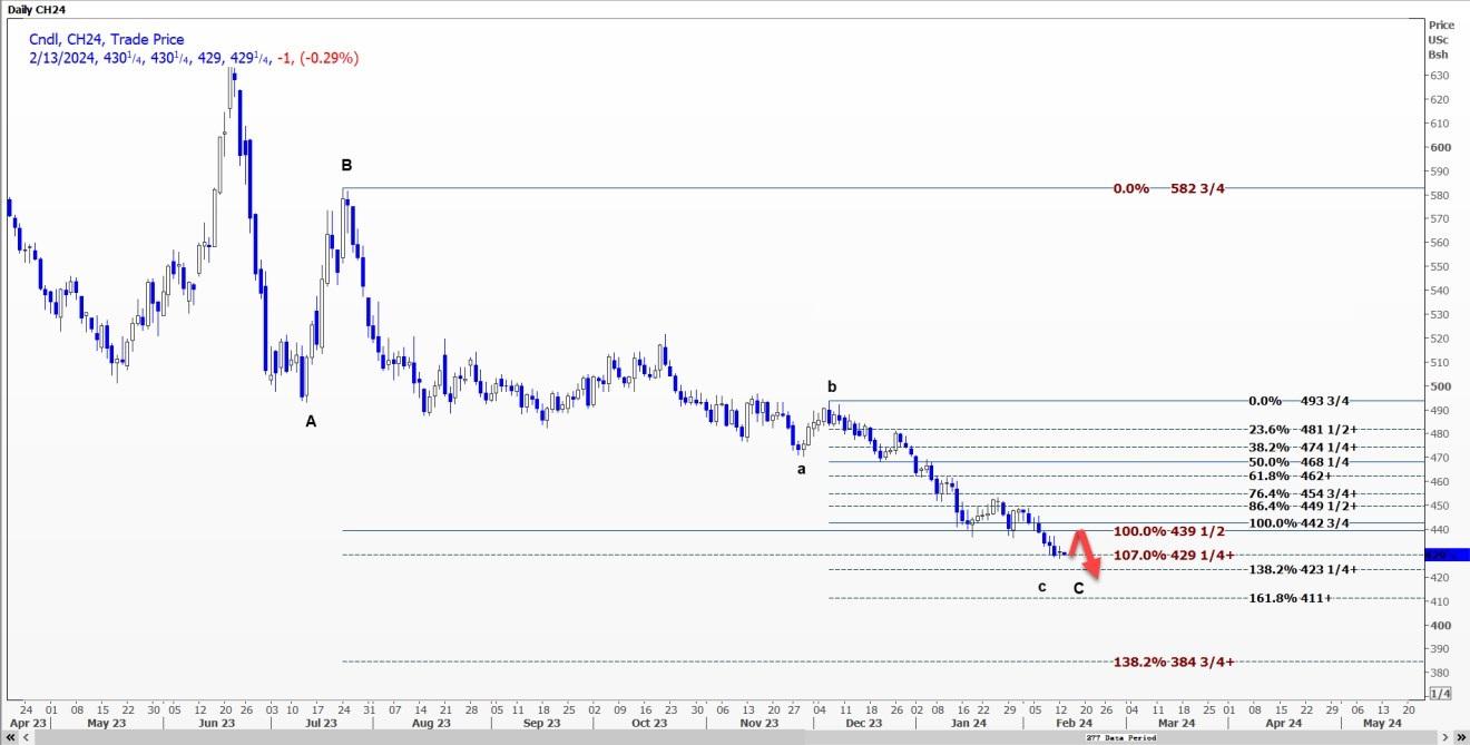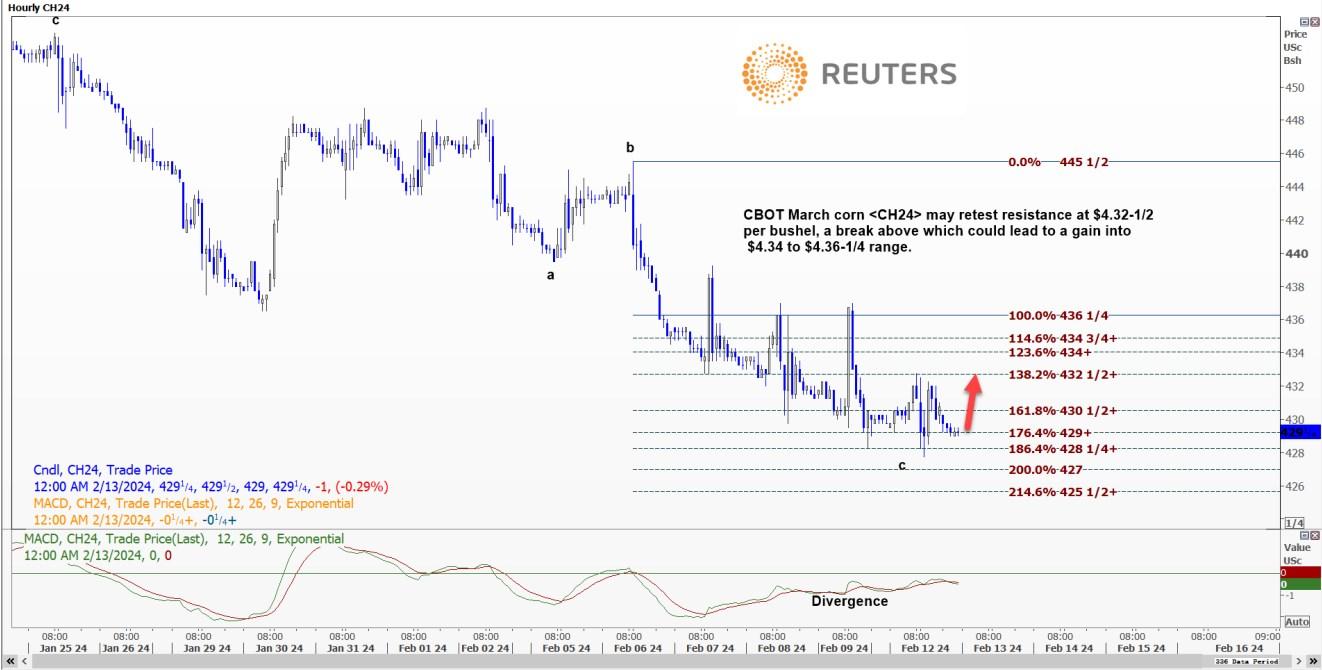 CBOT玉米可能会重新测试阻力位4.3250美元CBOT 3月玉米CH24可能会重新测试每蒲式耳4.3250美元的阻力位,突破该阻力位可能导致价格上涨至4.34美元至4.3625美元的区间。