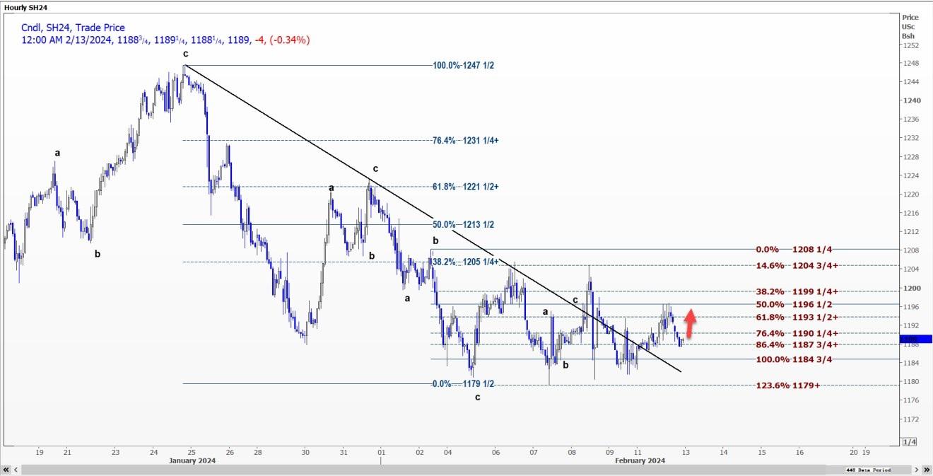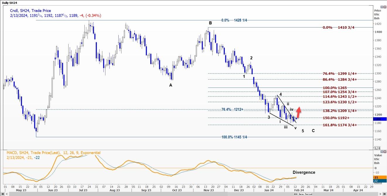 CBOT大豆可能重新测试阻力位11.9650美元CBOT大豆3月合约SH24可能会重新测试每蒲式耳11.9650美元的阻力位,突破该阻力位可能会导致上涨至12.0475美元。