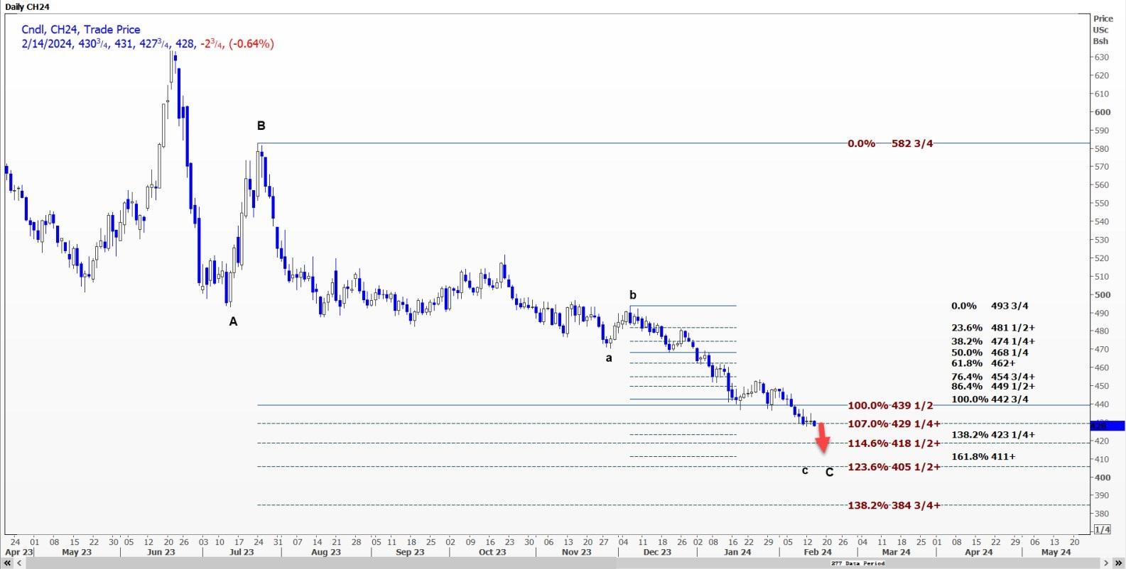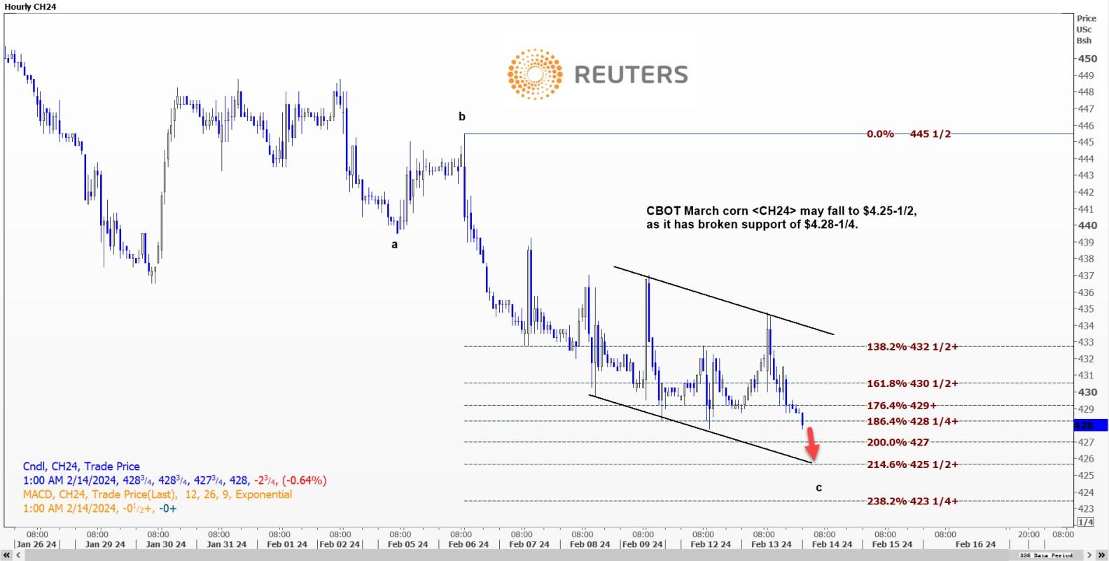 CBOT 3月玉米CH24可能跌至每蒲式耳4.2550美元,因为它已经突破了4.2825美元的支撑位。