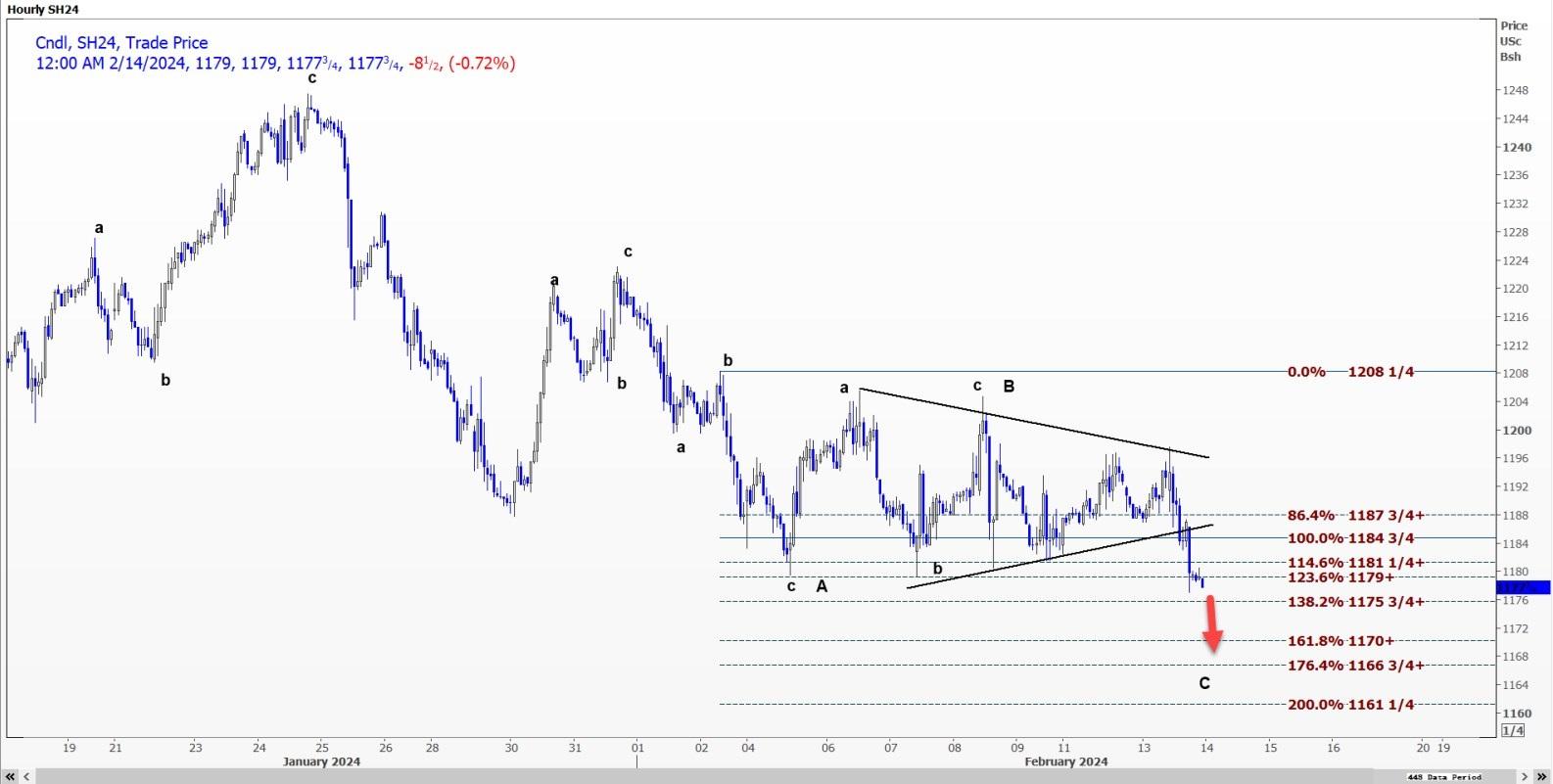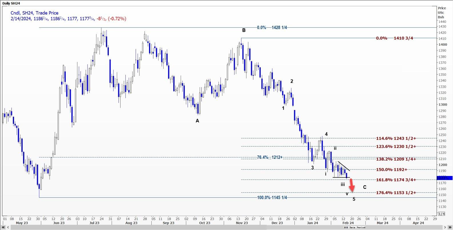根据楔形和预测分析,CBOT大豆3月合约SH24可能跌至每蒲式耳11.70美元。