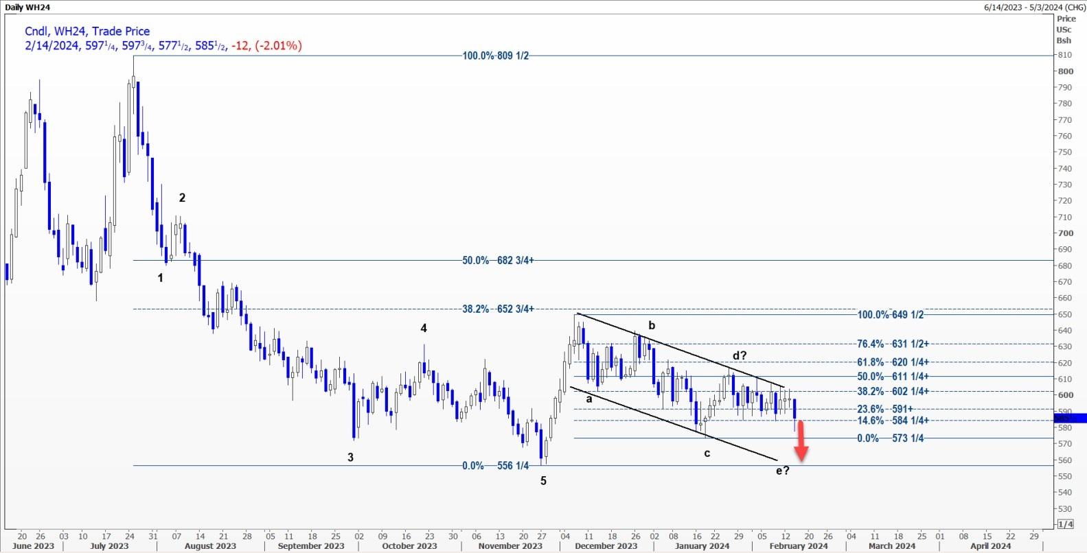 CBOT 3月小麦WH24可能会重新回到1月18日每蒲式耳5.7325美元的低点,因为从6.4950美元的下降趋势已经恢复。