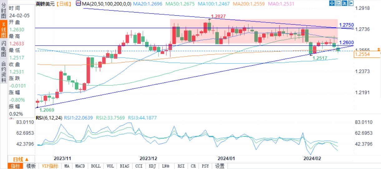 英镑兑美元推至近期交易区间以下。200日简单移动平均线和2023年10月26日上升趋势线目前是强有力的支撑位,考验着空头的决心。