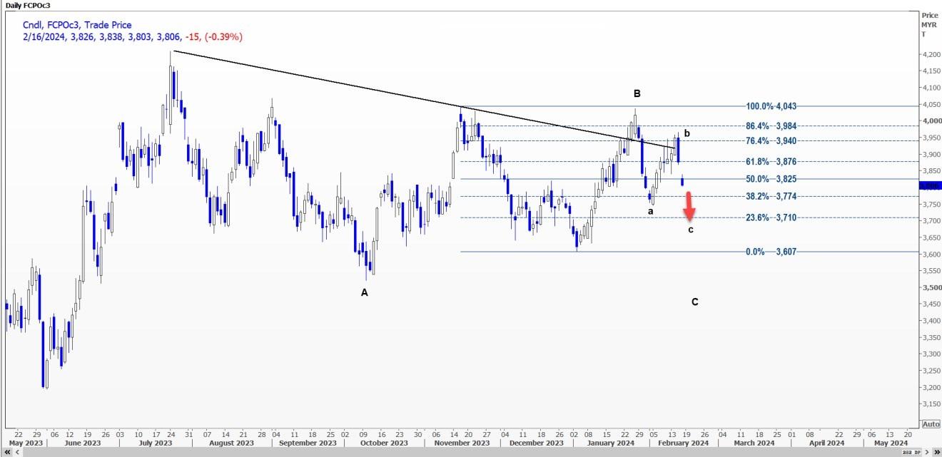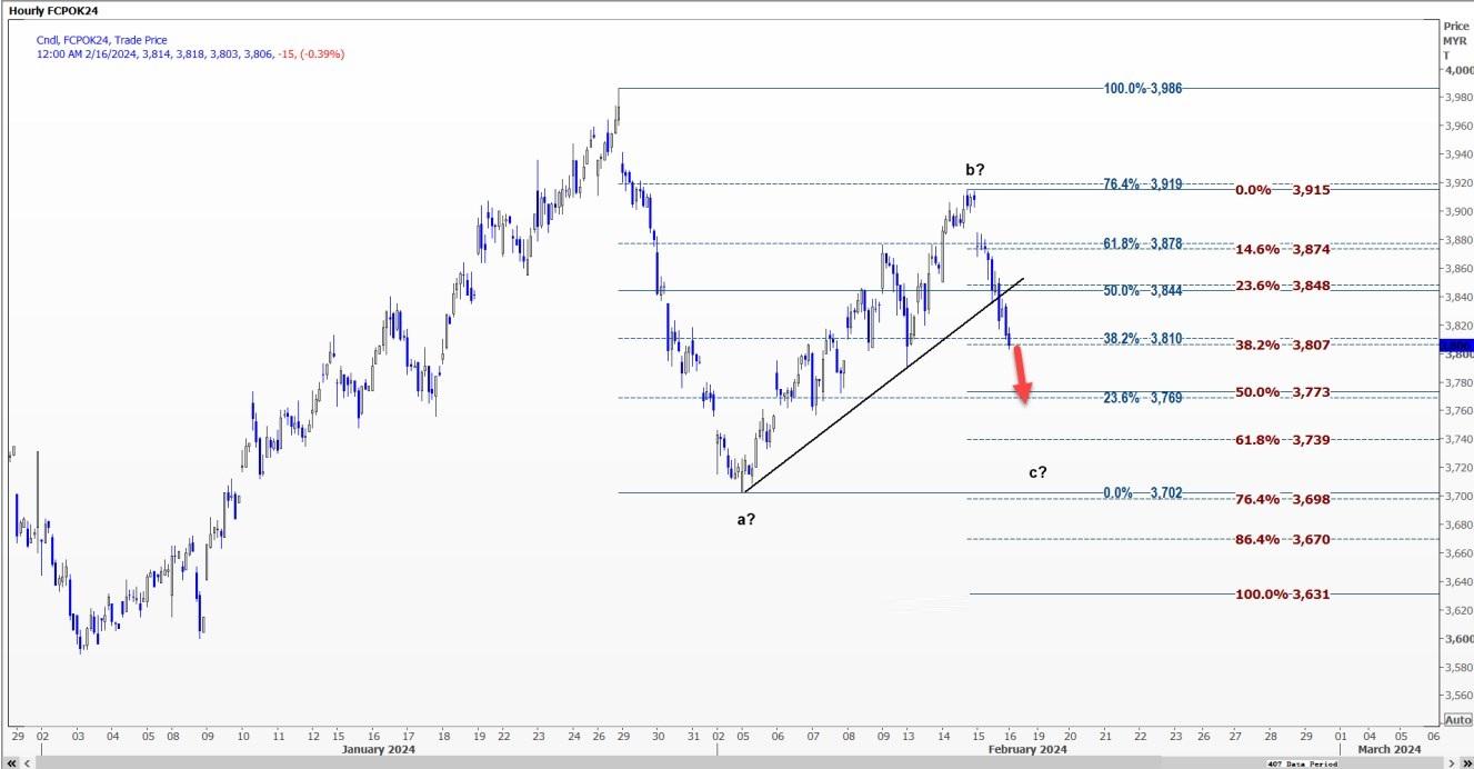 对5月合约FCPOK24的图表进行研究,发现3807-3810林吉特的支撑区域已或多或少被打破。此次突破打开了通往3773林吉特的道路。