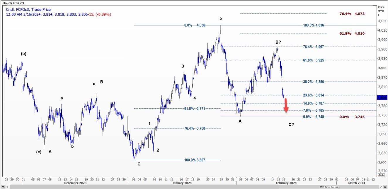 马棕榈油可能会继续下跌至每吨3745-3765林吉特之间。从2月15日高点3965林吉特急剧下跌,表明自1月26日高点4036林吉特以来的下跌趋势可能会延续。