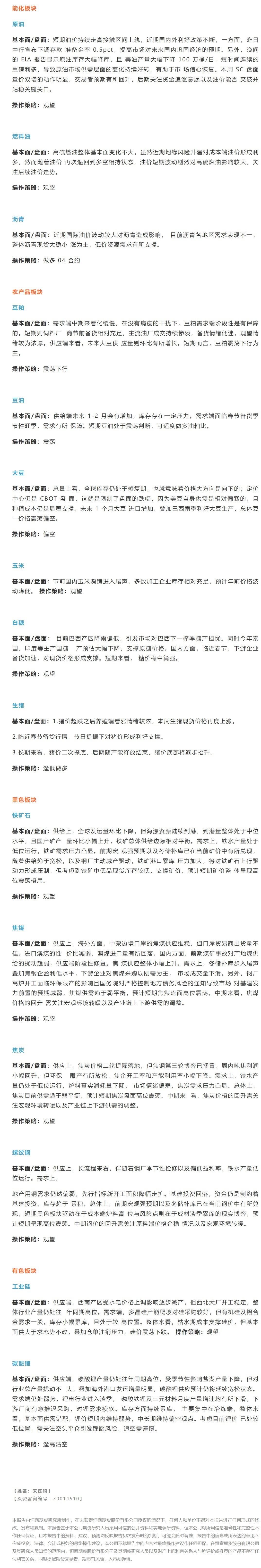 以下是恒泰期货今日早间交易策略,覆盖品种有:宏观分析、原油燃料油等能源化工、豆粕豆油大豆玉米白糖生猪等农产品、黑色系如铁矿石焦煤焦炭螺纹钢、有色系如工业硅碳酸锂等。