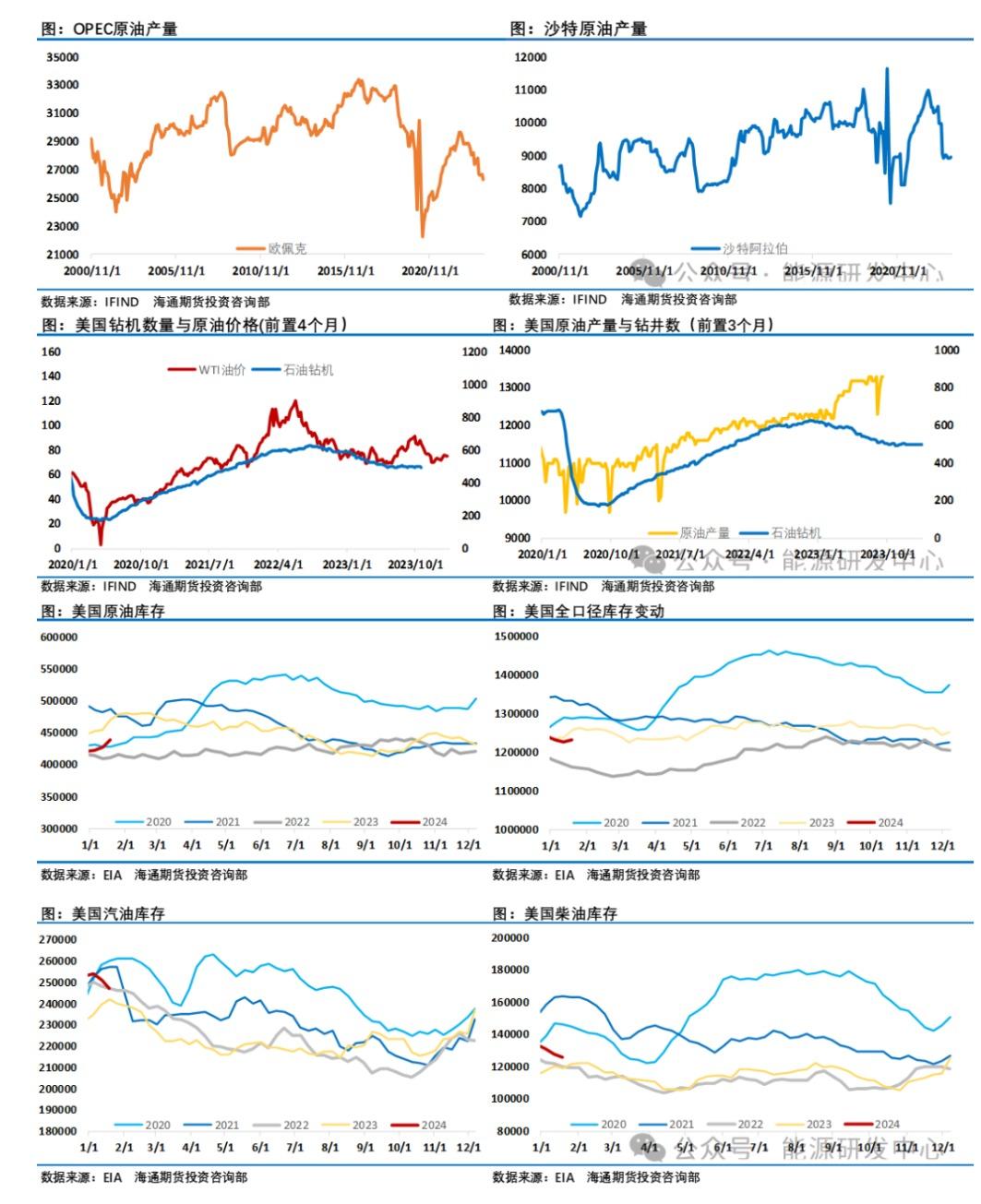 EIA在上周三公布的周度数据显示原油累库1201.8万桶,远超预期,再叠加油价短线超买的调整需求作用下油价从日内高位出现了大幅回落。而在此前一天周二(13日)欧佩克公布了最新月度原油市场报告。月报显示,由于新一轮自愿减产措施生效,欧佩克1月份原油产量下降35万桶/日至2634万桶/日。据二手来源显示:沙特阿拉伯原油产量在1月份增加了2.5万桶/日,达到896万桶/日;科威特原油产量在1月份下降了11万桶/日至243万桶/日;利比亚原油产量在1月份下降16.2万桶/日至101万桶/日。月报将2024年非欧佩克产油国的供应增速预测削减至120万桶/日;将2025年非欧佩克产油国供应增速预测保持在130万桶/日的水平。