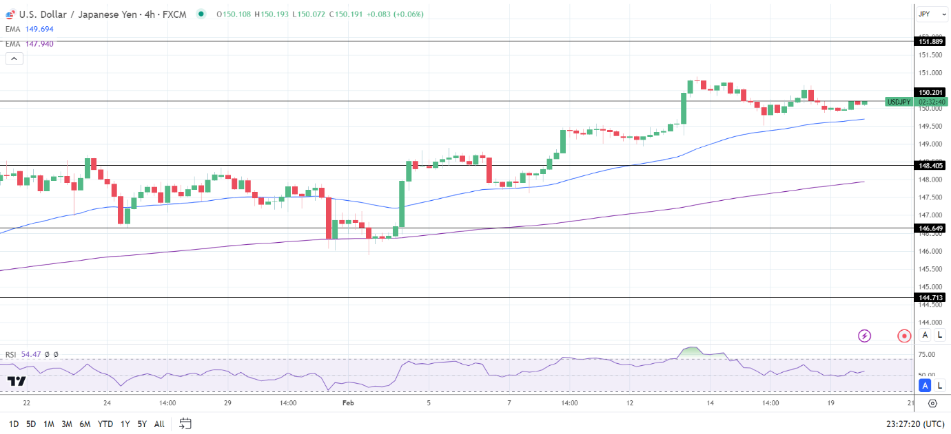 14周期4小时RSI为54.47,表明美元/日元在进入超买区域之前将升至151关口。