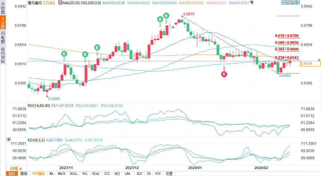 北京时间20:00,澳元主力报0.6541,涨0.03%,纽元主力报0.6137,涨0.15%。