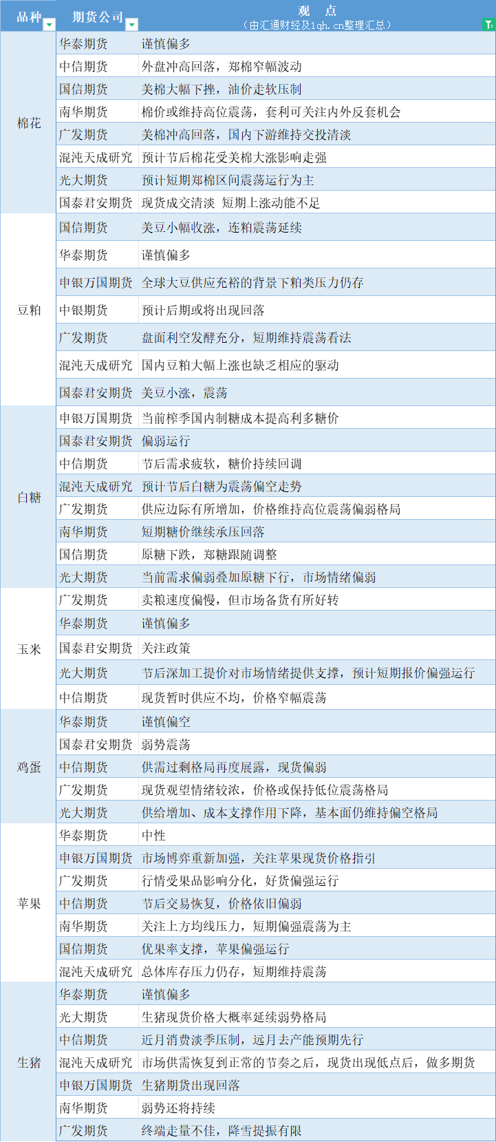 标题:期货公司观点汇总一张图:2月21日农产品(棉花、豆粕、白糖、玉米、鸡蛋、生猪等)