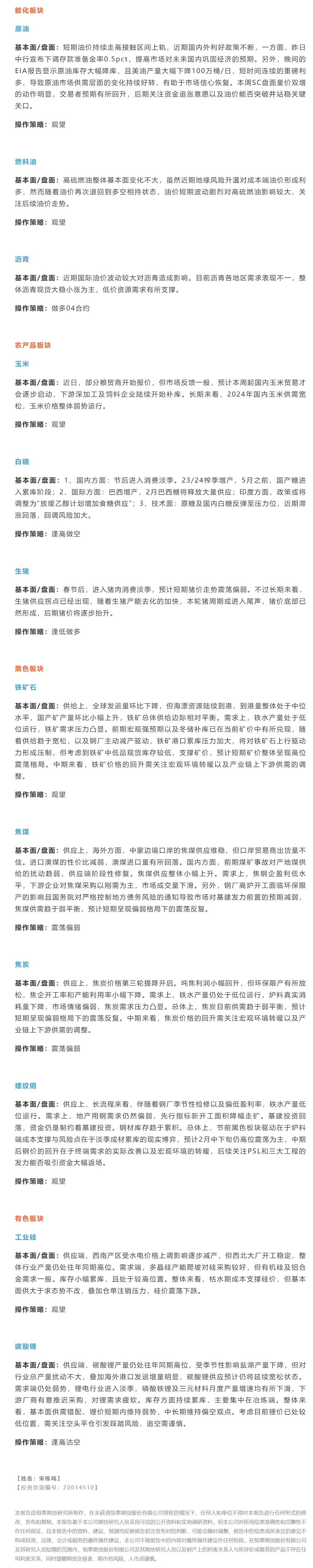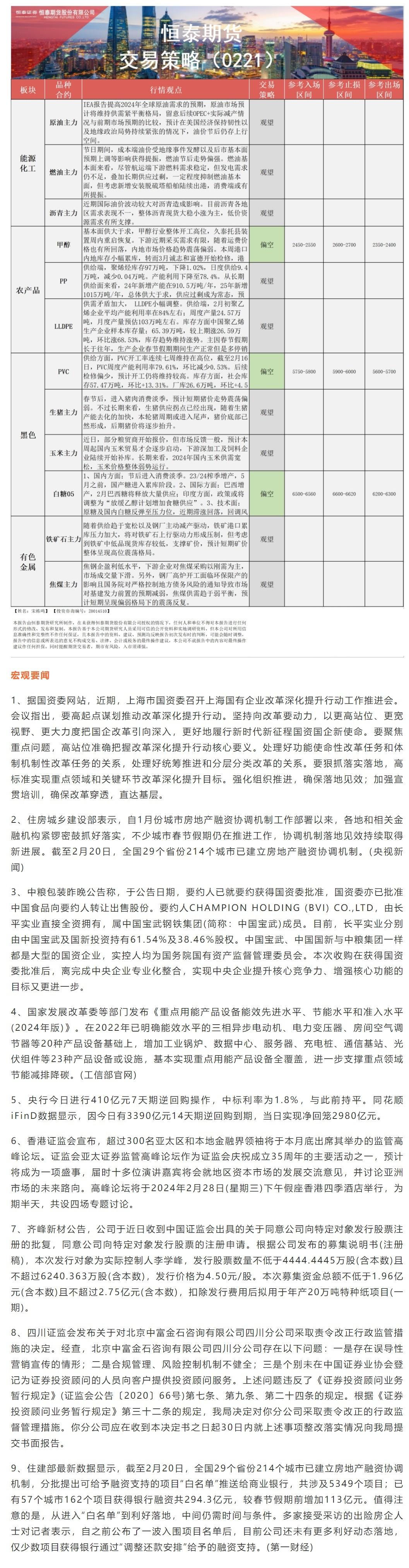 以下是恒泰期货今日早间交易策略,覆盖品种有:宏观分析、原油燃料油等能源化工、豆粕豆油大豆玉米白糖生猪等农产品、黑色系如铁矿石焦煤焦炭螺纹钢、有色系如工业硅碳酸锂等。