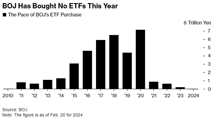 在2020年底成为日本股票的最大持有者后,日本央行已经显着放缓了此类购买速度。当局去年只购买了3次股票基金,而且根本没有购买REITs。